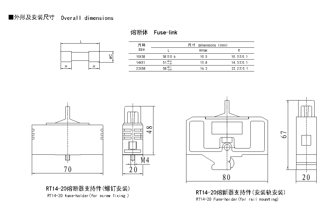 The fuse-holder is the assembly of fuse-base and fuse-carrier. The base is the fixed part of the fuse-holder, which is composed of electric contacts parts coordinated with the fuse-link and connecting terminals. The fuse-carrier is a movable part of the fuse-holder used to load. unload and carry the fuse-link. Two styles of screw fixing and rail mounting of fuse-holder are available.