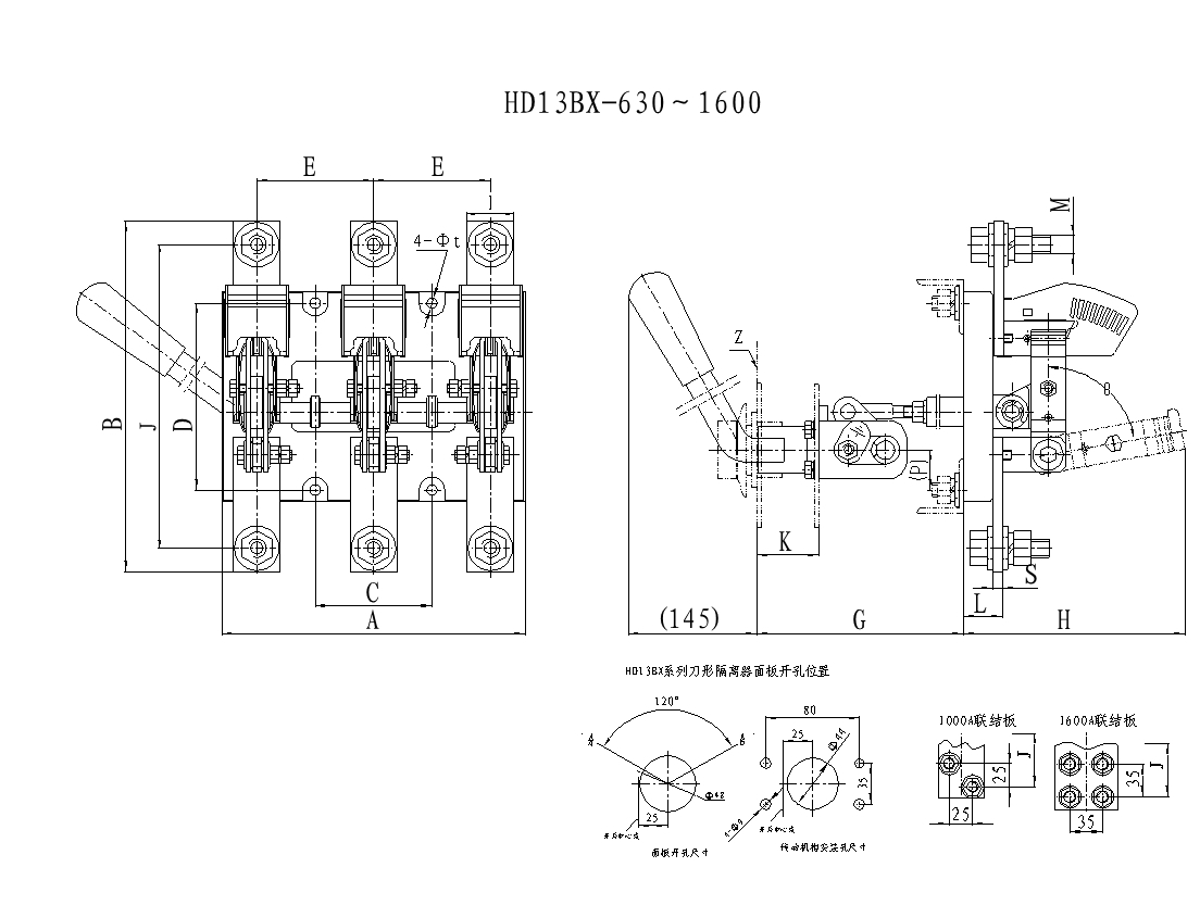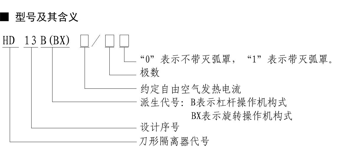 HD13B(BX)系列刀形隔離器適用于額定工作電壓為交流380V,額定頻率50Hz,額定工作電流至1600A。主要用于工業(yè)企業(yè)的配電設(shè)備中,用于接通或分?jǐn)嗑€路或者作為隔離開關(guān)之用。
