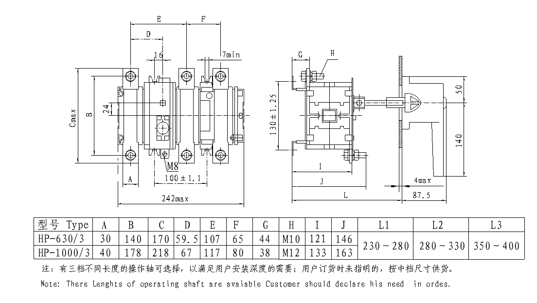本系列隔離開關(guān)由刀型靜觸頭、滾動(dòng)動(dòng)觸頭及滅弧裝置組成的接觸系統(tǒng) 均組裝在由耐弧工程塑料制成的封閉底座內(nèi),能達(dá)到零飛弧。操作機(jī)構(gòu)由具有 彈簧儲(chǔ)能的連桿傳動(dòng)機(jī)構(gòu)構(gòu)成,靠彈簧力完成開關(guān)的分、合,使開關(guān)動(dòng)作無關(guān) 人力操作。手柄由操作手柄和傳動(dòng)軸等構(gòu)成,屬旋轉(zhuǎn)操作方式。當(dāng)手柄旋轉(zhuǎn)操 作時(shí),使操作機(jī)構(gòu)彈簧儲(chǔ)能,靠?jī)?chǔ)能的彈簧力釋放帶動(dòng)動(dòng)觸頭與靜觸頭形成 合、分兩種狀態(tài),從而達(dá)到開關(guān)分、合主電路的目的。